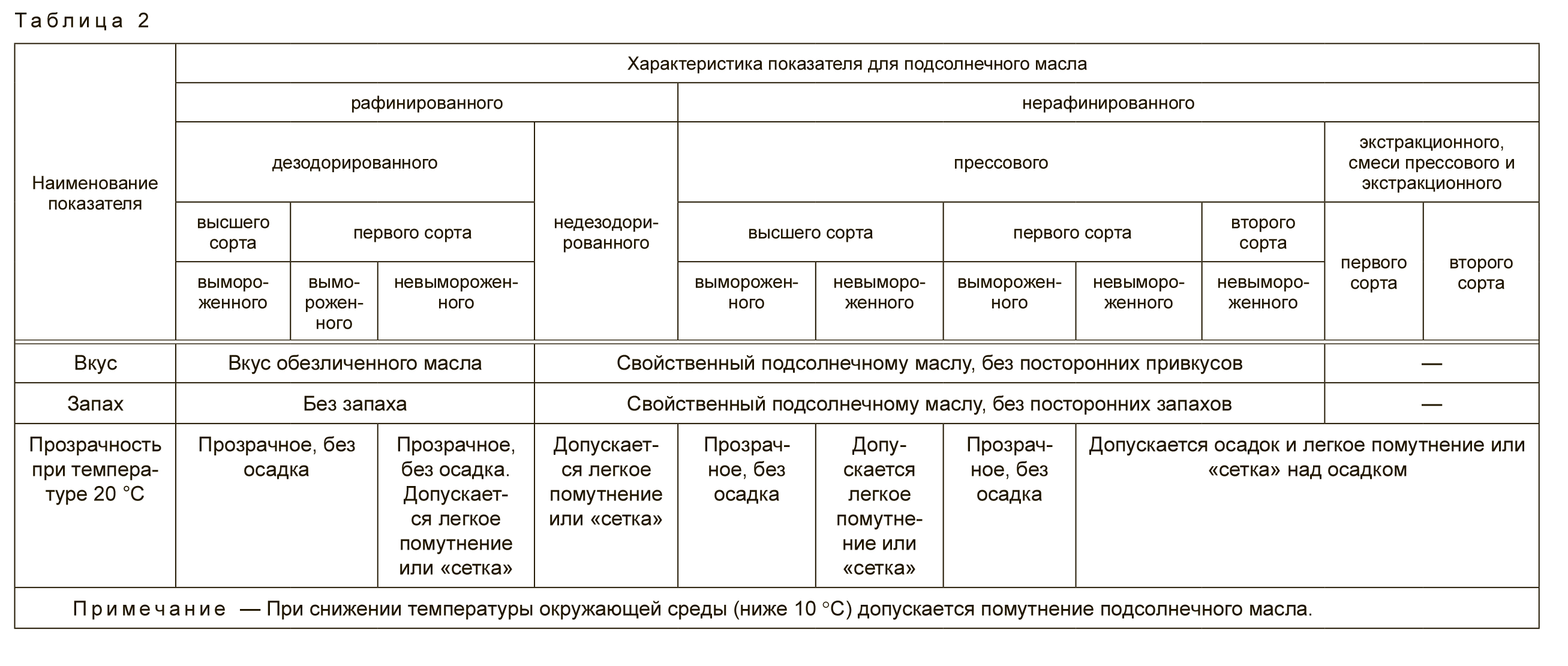 По органолептическим показателям подсолнечное масло должно соответствовать требованиям, указанным в таблице 2