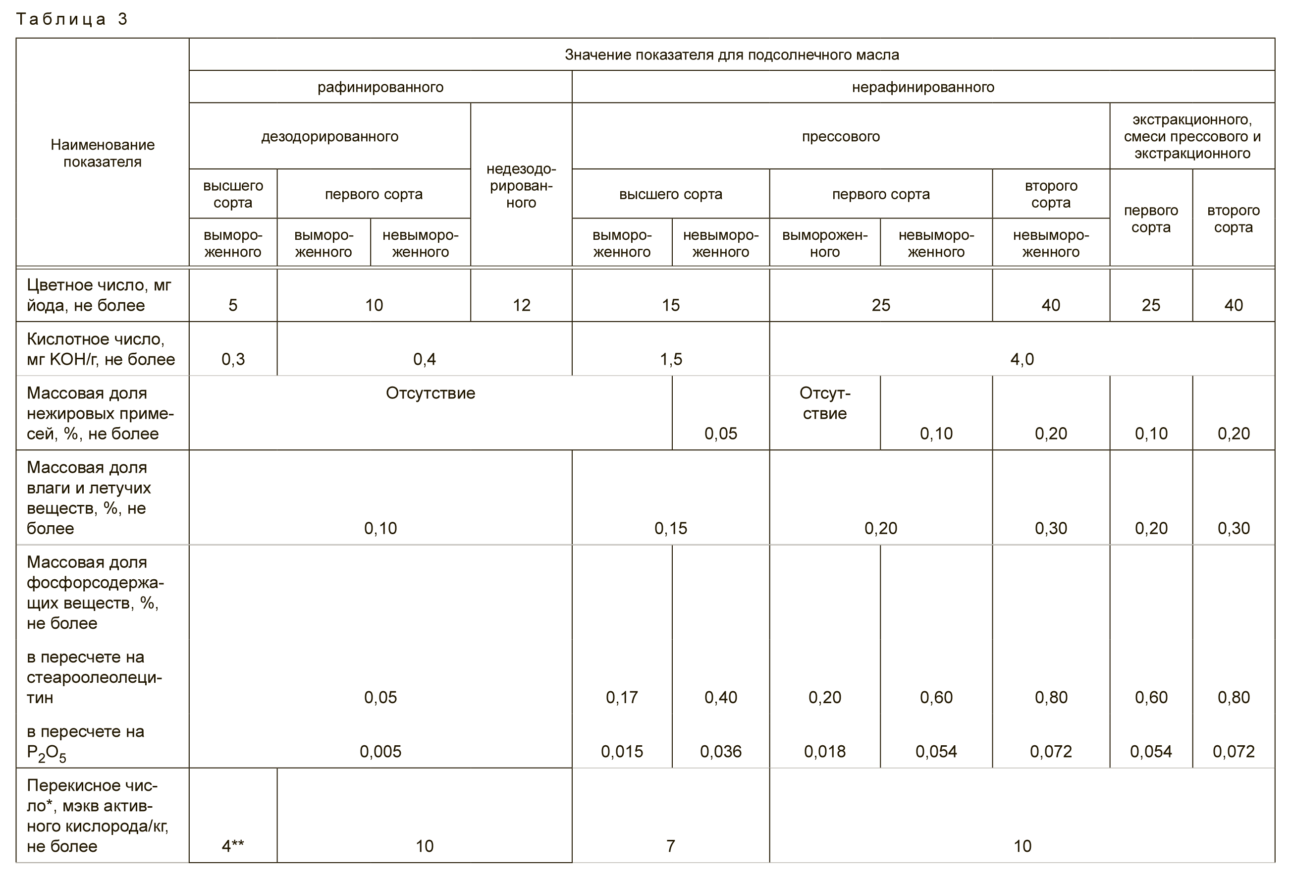 По физико-химическим показателям подсолнечное масло должно соответствовать требованиям, указанным в таблице 3